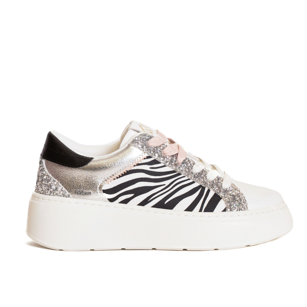 Dettaglio: IN MULTIMATERIALE, CON PARTI IN GLITTER E PELLE SINTETICA LAMINATA